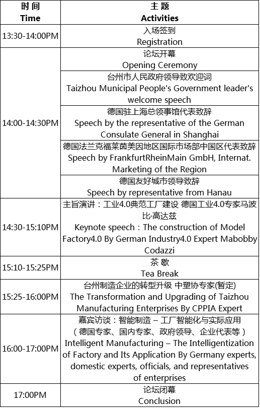 一帶一路合作共贏暨中德智能制造高峰論壇由臺州市人民政府主辦,臺州市倡議和創(chuàng)新驅(qū)動 發(fā)展戰(zhàn)略,解讀工業(yè)4.0與中國制造2025,集思廣益,探討中國制造業(yè)尤其是臺州制造 業(yè)的未來發(fā)展之路,加快推進(jìn)智能制造發(fā)展和臺州制造業(yè)轉(zhuǎn)型升級,推動臺州“國際智 造名城”建設(shè)。